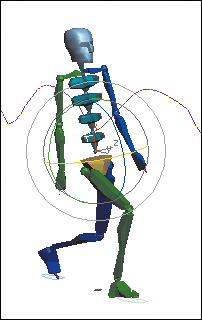 2. | On the same keyframes you adjusted for the COM before, rotate the Bip01 Spine object about its X and Y axis so the arms swing in synchronization with the leg movements.