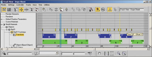 It’s important to distinguish between footstep placement and footstep timing. Footstep placement is the physical location of footsteps in the viewport. Footstep timing is the frame on which a footstep key starts and the number of frames it lasts, as determined by the gait and other parameters, such as 2 Feet Down and Airborne.