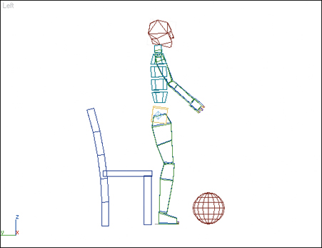 Your next task is to make the ball “stick” to one of the biped’s hands at frame 50, using Link Constraint. You could stick both hands to the ball if you wanted to, but you’d still have to keyframe it one hand at a time.