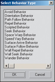 To set up a behavior, select the Crowd helper and go to the Setup rollout on the Modify panel. Click New in the Behaviors section, and choose a behavior from the list that appears.