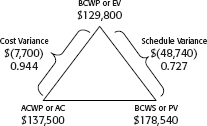 CV = ($7,700) unfavorable = ($129,800 – $137,500) CPI = .944; project over budget = ($129,800 / $137,500)