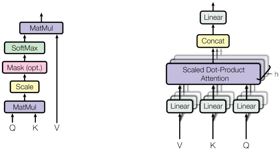 The transformer uses dot product attention (the left-hand side diagram of the preceding diagram), which follows the general attention procedure we introduced in the Seq2seq with attention section (as we have already mentioned, it is not restricted to RNN models). We can define it with the following formula:
