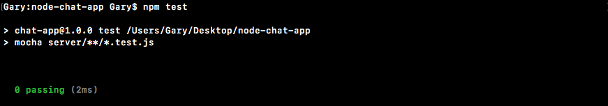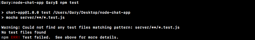 Here we have the server-test file globbing pattern; it could not resolve any files. We can fix this issue by simply adding a test file. I'm going to add a test file for the message utility, message.test.js. Now we can go ahead and rerun the npm test command. This time around it does indeed find a file and we see we have zero passing tests, which is a great starting point: