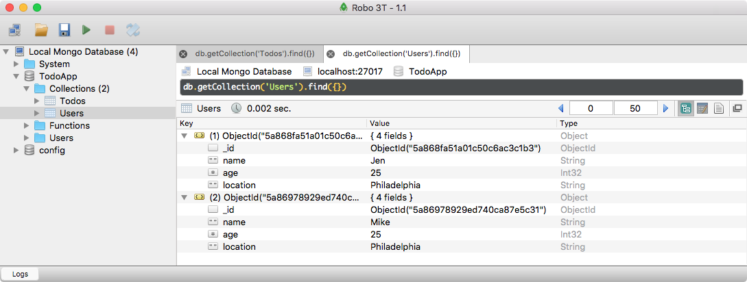 Let's go ahead and comment out findOneAndDelete first. We'll run the deleteMany statement. Over in the Terminal, I can shut down the current connection, start it up again, and if we go over to Robomongo, we should see that those three documents were deleted. I'm going to right-click on Users and view the documents:
