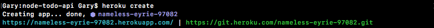 In order to get set up, over inside of the Terminal we're going to create a new Heroku app because currently we don't have one. heroku create is the command to get that done:
