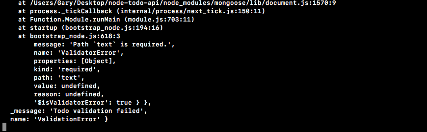 When you set required equal to true, the value must exist, so if I were to try to save this Todo it would fail. And we can prove this. We can save the file, head over to the Terminal, shut things down, and restart it: