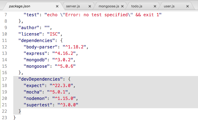 In Atom, inside my package.json file, I now have my devDependencies listed out: