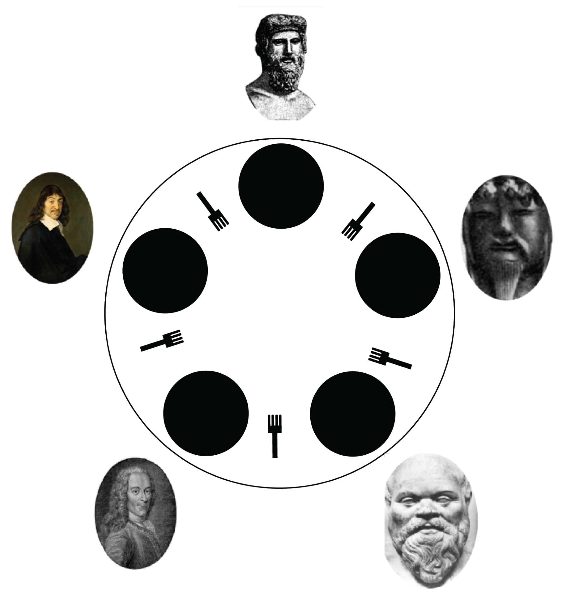 Recall our example of deadlock, the Dining Philosophers problem, illustrated as follows: