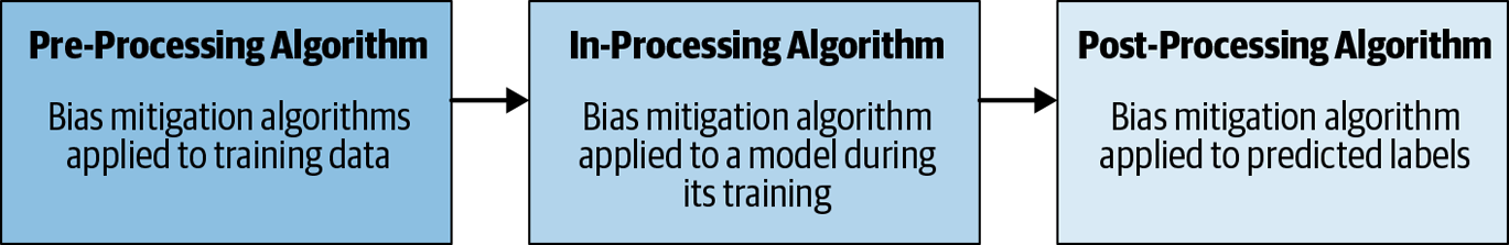 We can measure data and model fairness at different points in the machine learning pipeline. In this chapter, we look at the pre-processing, in-processing, and post-processing categories of bias mitigation algorithms.