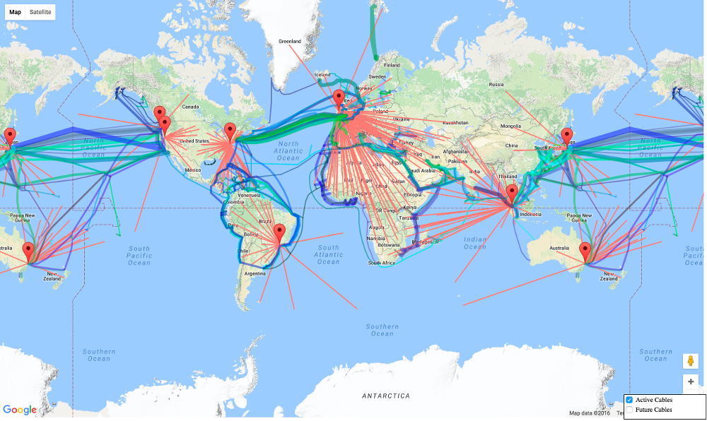 Cloud providers also manage global distribution of services to ensure low latency. The following image shows the AWS regional data center locations combined with underwater internet cabling: