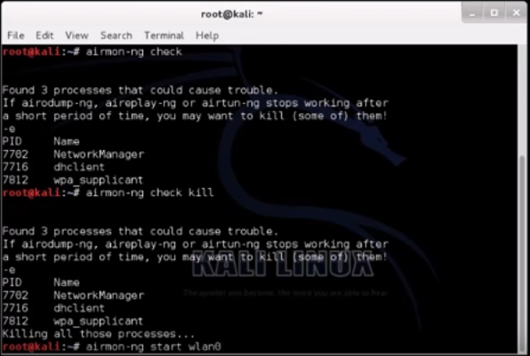 airmon-ng is used for the enumeration of the target wireless access point. airbase-ng is used to create the clone or twin of the real access point. aireplay-ng has two main functions in this role. The first is to send the deauthenication frame to the client ...