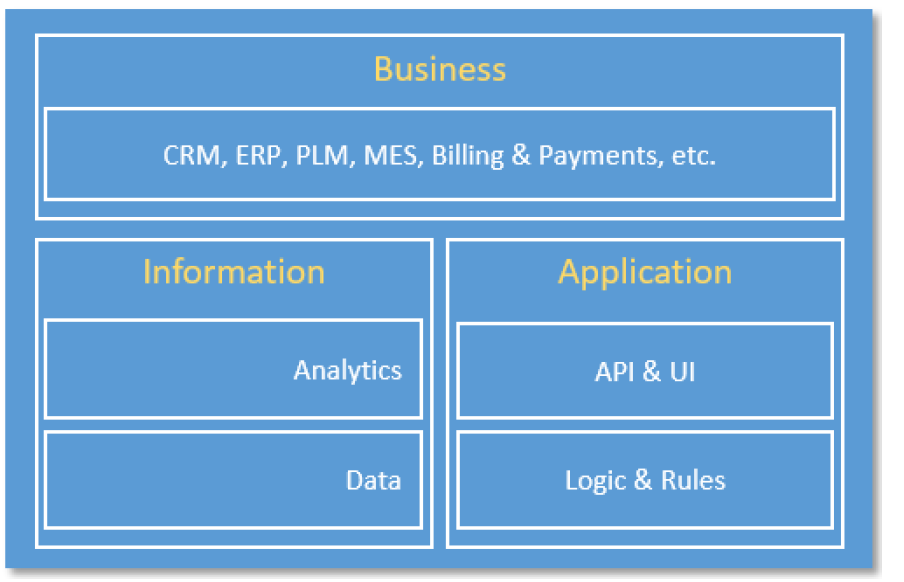 The information domain consists of functions concerned with gathering data predominantly from, but not limited to, the control domain. However, while the control domain monitors data in real time, analyzes it, and applies rules to perform local control of systems, the data gathered in the information domain is stored, or persisted, and transformed for analysis. It could also be applied to machine learning, potentially discovering deeper intelligence about the overall system and operations.