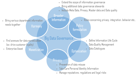 Any big data enterprise would need to develop and enhance broader enterprise information governance by bringing rules or policies for optimization and privacy and also find avenues for monetizing (value) at the same time as ensuring regulatory compliance and facilitating prudent risk management: