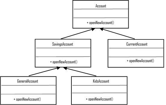 The preceding class diagram shows the application of the open and close principle on the Account class and its subclasses. The account can be any type, savings or current. A ...
