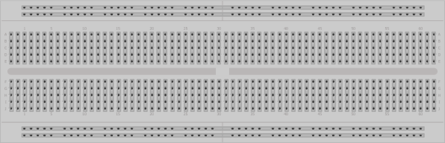 Breadboards come in various sizes and configurations. The simplest kind is just a grid of holes in a plastic block. Inside are strips of metal that provide electrical connections between holes in the shorter rows. Pushing the legs of two different components into the same row joins them together electrically. A deep channel running down the middle indicates that there is a break in connections there, meaning you can push a chip in with the legs at either side of the channel without connecting them together.