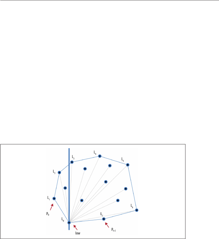 まで時計回りに計算する。次に、下側の部分凸包を同じ点集合に対して