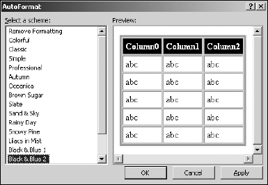 The AutoFormat window for GridView, shown in Figure 10-1, includes built-in styles, such as Colorful, Professional, and Black & Blue. You can apply one of the AutoFormat styles as a starting point and then tweak the font, colors, spacing, and other properties to suit your needs. (Just be careful not to overwrite your changes by reapplying the original AutoFormat.)