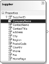 At runtime, the ListView you create in the preceding section shows SupplerID and CategoryID values, which are numbers. Instead of asking viewers to match the SupplierID to the company name, you can do it for them. Figure 8-2 shows that NWDataClasses.dbml includes a Supplier object with a CompanyName property. Both the company and category names are available to display in the ListView control.