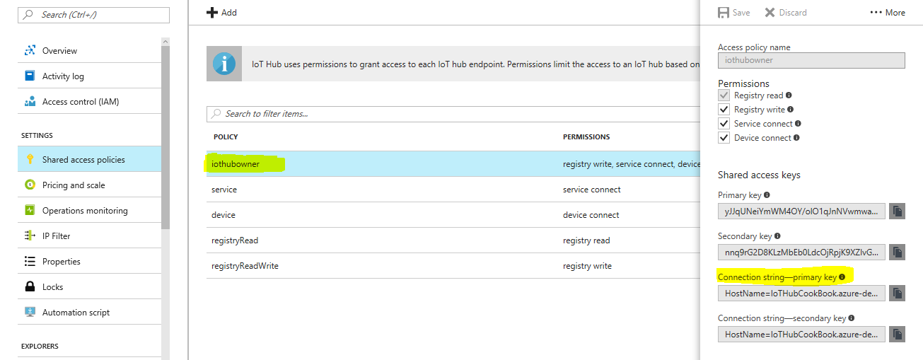 - From the Azure portal, navigate to the IoT Hub that you created, and copy the connection details for the IoT Hub owner access rights: