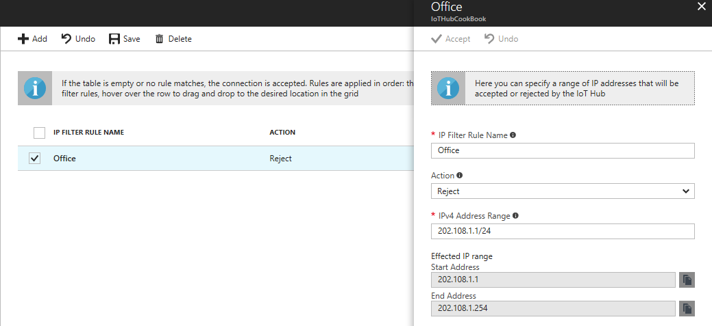Using the Azure portal, we will configure the IoT Hub for IP filtering: