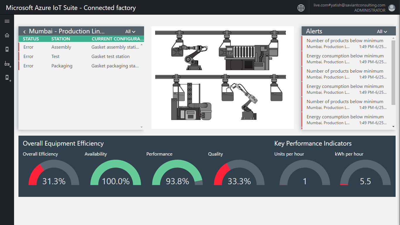 The factories panel allows us to select and drill down to any location and see the performance of the factory. It lists the status and configuration for the production line that we can select from.