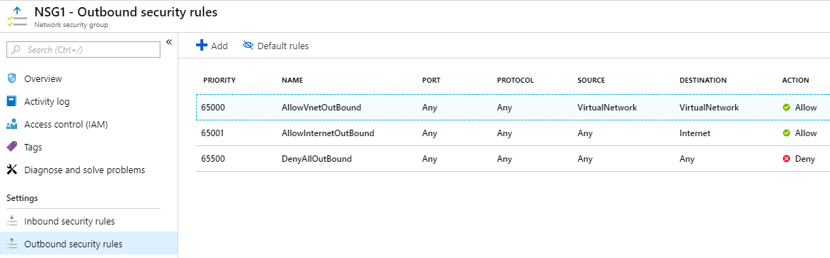 - In the NSG blade, locate the Outbound security rules option under Settings.