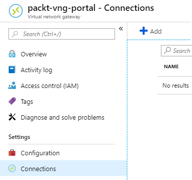 - In the virtual network gateway blade, select Connections and select Add to add a new connection: