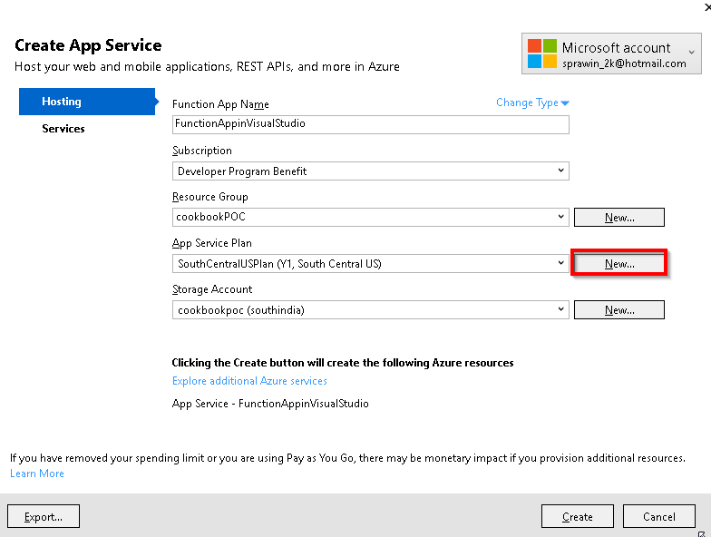 In the Create App Service window, you can choose the existing resources or click on the New button to choose the new Resource Group, the App Service Plan, and the Storage Account, as shown in the following screenshot: