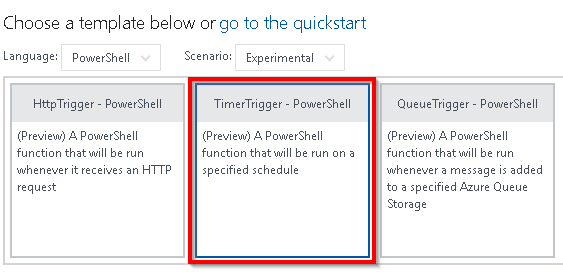 Navigate to your Azure Management portal and create a TimerTrigger - PowerShell Azure Function by selecting PowerShell in the Language dropdown, as shown in the following screenshot:
