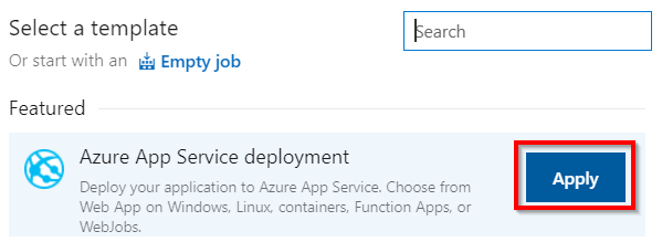 - The next step is to choose a Release definition template. In the Select a template popup, select Azure App Service deployment and click on the Apply button, as shown in the following screenshot. Immediately after clicking on the Apply button, a new environment (stage) popup will be displayed. For now, just close the Environment popup: