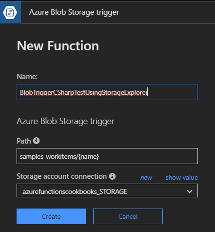 - Create a new Blob trigger by choosing the Azure Blob Storage trigger template, as shown here: