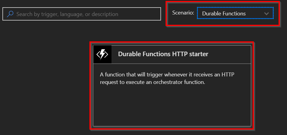 - Create a new Durable Functions HTTP starter function by choosing Durable Functions in the Scenario drop-down menu, as shown in the following screenshot: