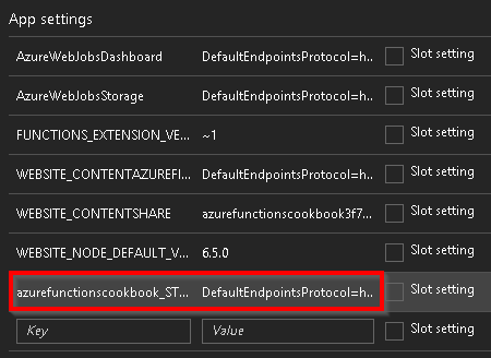 When you create a new storage connection (refer to step 3 of the How to do it... section of this recipe), new App settings will be created: