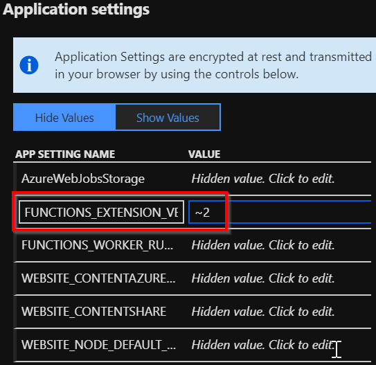 Create a new function app if you haven't created one already. Ensure that the runtime version is~2in theApplication settings, as shown in the following screenshot: