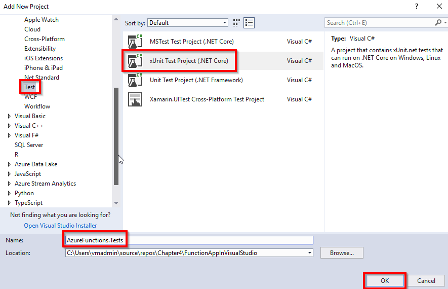 - Create a new unit testing project by right-clicking on the solution and then clicking on Add New Project. In the Add New Project window, choose Test in the list of Project Type and choose xUnit Test Project(.NET Core) in the list of projects, as shown here: