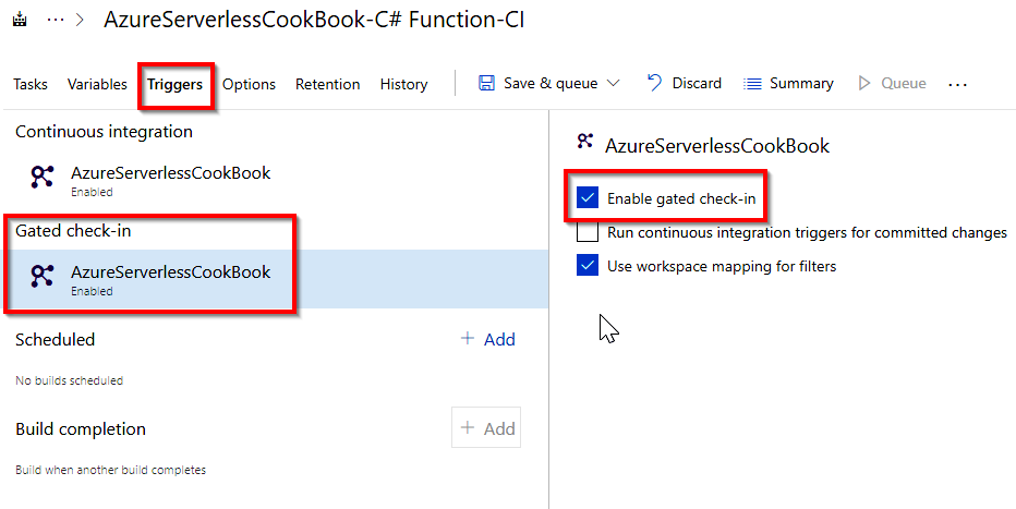 If you would like to restrict developers to checking in code only after a successful build, then you need to enable gated-check-in. In order to enable this, edit the build definition and then navigate to the Triggers tab and select Enable gated check-in, as shown in the following screenshot: