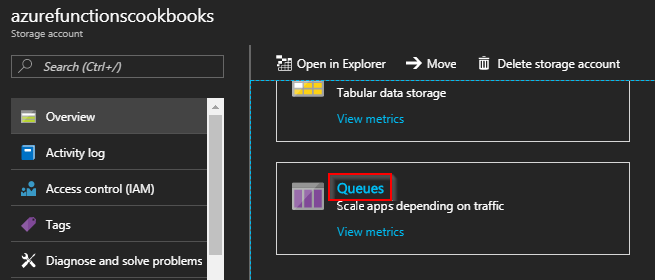 - Navigate to the storage account's Overview blade and click on Queues, as shown in the following screenshot: