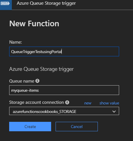 - Create a new Azure Storage Queue trigger named QueueTriggerTestusingPortal, as shown in the following screenshot. Take note of the Queue name, myqueue-items, as we need to create a Queue service with the same name later using the Azure Management portal: