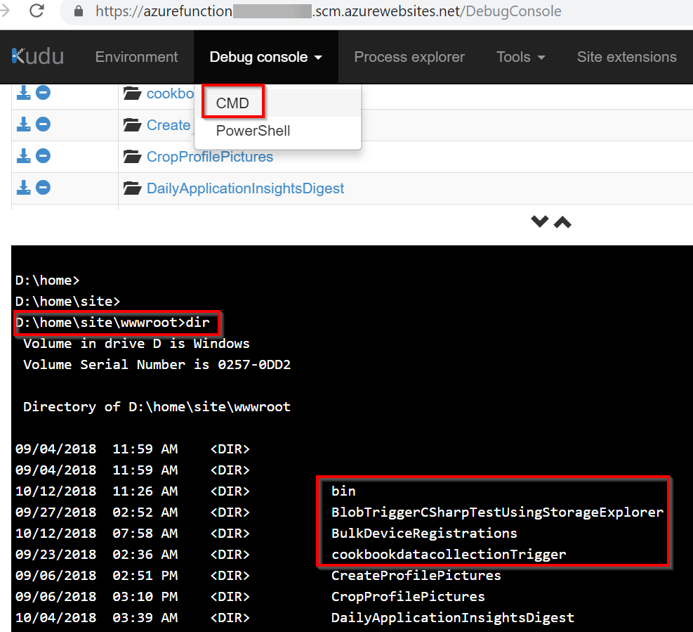 As you might already be aware, each function app can have multiple functions hosted in it. All the code related to those functions will be located in the D:\home\site\wwwroot folder, as follows: