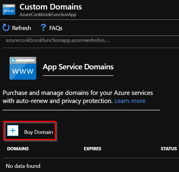 Create a domain with any domain registrars. You can also purchase a domain right from the portal using the Buy Domain button, which is available in the Custom Domains blade: