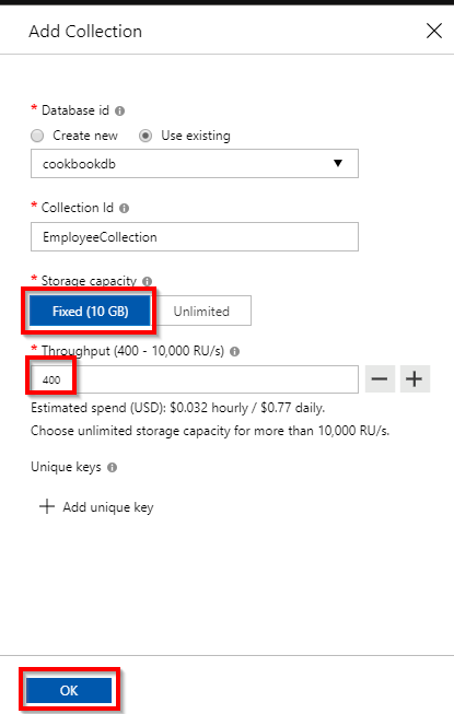 - Create a Cosmos database and a collection with fixed storage, and set the request units to 400 per second, as shown in the following screenshot: