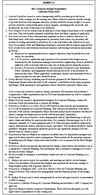 A company can begin the process by issuing a budget preparation calendar, which consists of an overall review of each sequential step in the budgeting process. Accompanying this is a rough time schedule in which the budgeting process will be implemented identifying deadlines, the personnel responsible, and those to receive this information. The plan furnishes the structure of the budgeting process and the overall objectives. These items are crucial for the budgeting process and must be completed before the process can proceed. An illustrative budget calendar for a company is presented in Exhibit 3.5.