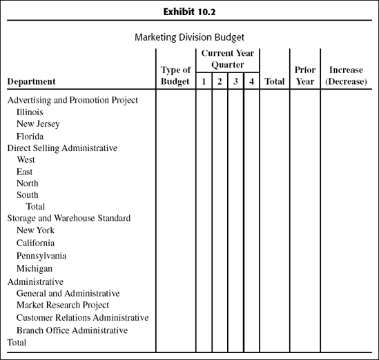 A typical budget for a marketing division is shown in Exhibit 10.2.