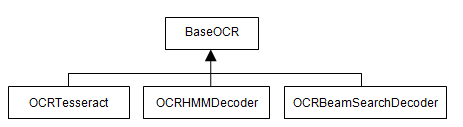 In OpenCV, all OCR-specific classes derive from the BaseOCR virtual class. This class provides a common interface for the OCR execution method itself. Specific implementations must inherit from this class. By default, the text module provides three different implementations: OCRTesseract, OCRHMMDecoder, and OCRBeamSearchDecoder.