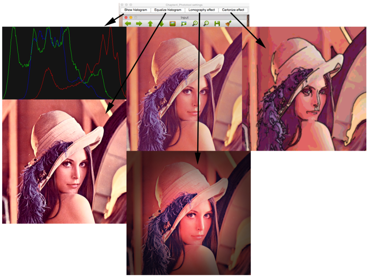 Before we start with the image processing algorithms, we create the main user interface for our application. We are going to use the Qt-based user interface to allow us to create single buttons. The application receives one input parameter to load the image to process, and we are going to create four buttons, as follows: