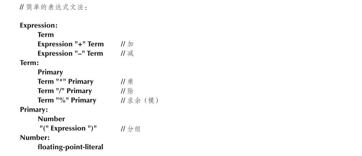 这是一个简单的规则集合,最后一条规则读作“一个Number是一个浮点常量”,倒数第二条规则表明“一个Primary是一个Number,或者是'('后接一个Expression再接一个')'”。针对Expression与Term的规则类似,都是依赖其后的规则来定义。