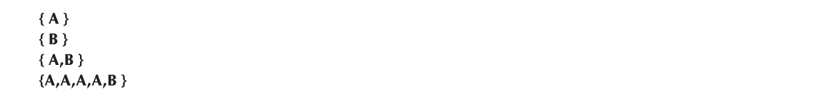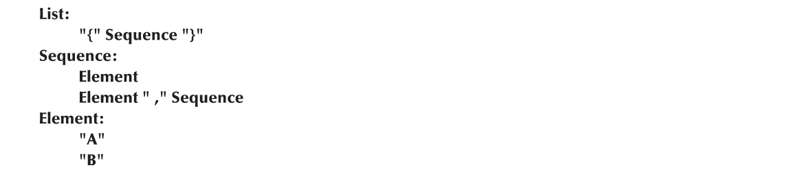 因此,上面文法的含义是,一个Sequence是一个Element,或者是一个Element后面紧跟一个Sequence,并且两者以逗号隔开。一个Element是字母A或是字母B。List是在花括号中的一个Sequence。我们可以生成一些List(如何生成的?):