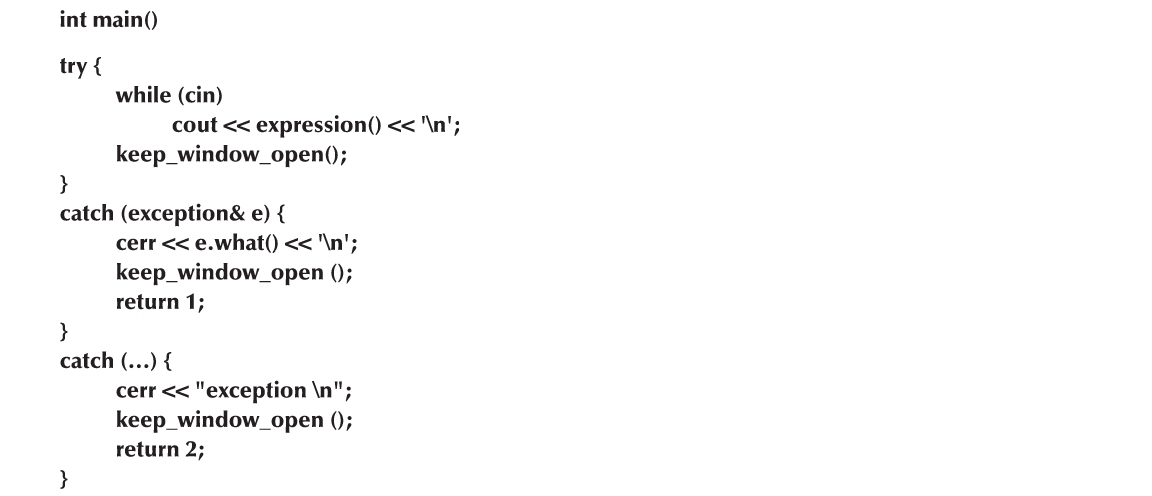 计算器程序的第一个版本(包括get_token())在文件calculator00.cpp中。请尝试编译、运行它,验证结果。