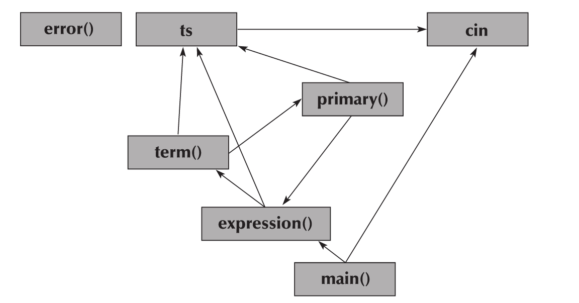 在这里,声明的顺序是很重要的,一个名字在被声明之前是不能使用的,因此ts必须在ts.get()使用之前声明,error()必须在语法分析函数之前声明。在调用图中有一个非常有趣的循环:expression()调用term(),term()调用primary(),primary()又调用了expression()。