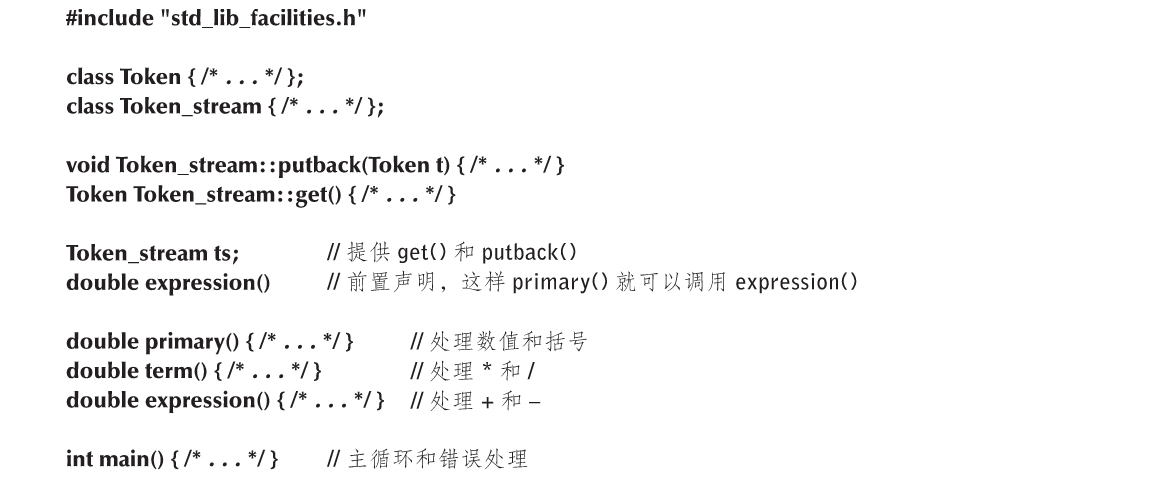这就意味着我们不能简单地定义这三个函数:没有任何一种顺序能满足先定义后使用的原则。因此,至少有一个函数必须先只给出声明而非定义。我们选择先声明expression()函数,这种方式称为前置声明(forward declare)。
